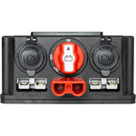 The Power Box is controlled with a 50A battery switch and monitored with an LED voltmeter. The switch features a removable knob for extra security. The power box includes two power sockets, two Anderson outputs, one USB-C port, and four USB-A ports.