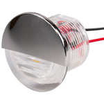 This LED Flush Mount Round Courtesy Light fits in a 1-1/8" diameter hole. The special lens design aims the light downward and the stainless steel cover focuses the light, preventing it from projecting upwards. Available in blue or white. 20 lumens. Low amperage draws 0.02 amps @ 12V.