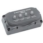 The 706-4W 24hr service module consists of 1 x 5amp and 3 x 15amp push to reset Carling CLB Series thermal circuit breakers. Suitable for essential circuits such as bilge pump auto float switch supplies and stereo memory circuits. The push to reset function ensures essential 24hr circuits cannot be switched off inadvertently. This is contained in the contour lock double module.