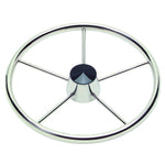 The Destroyer Wheel is a 5-spoke stainless steel steering wheel that can be a great addition to any boat. This specific steering wheel comes with a fitted black center cap.