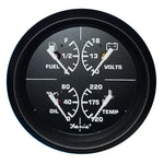 Euro Black 4" Multifunction Gauge - Volt/Fuel/Oil/Water TemperaturePerimeter-lighted Black dial with bold White graphics, Black aluminum bezel, contoured White pointer and flat glass lens. Multi-Function Gauge Displays: Fuel (E to F) Volts (10 to 18 AMPS)...