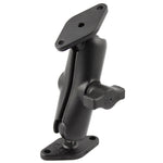 The RAM-B-102U consists of a double socket arm and two diamond bases. The diamond bases measure 2.43" x 1.31" diamond base and contain two holes 1.912" from center to center, positioned at both ends of the diamond base. The hole pattern found on the diamond bases will connect to many RAM cradles, as well as third party cradles including mounts with the industry standard AMPS hole pattern. Designed into the mount is a 1" diameter patented rubber ball and socket system with adjustment points at both socket ends of the arm.
