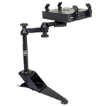 The RAM® No-Drill™ Laptop Stand System installs quickly and easily into the specified vehicles using the existing hardware of the passenger side seat rails. This configuration provides a telescoping feature that ranges from 12 to 18 inches. Dual swing arms provide articulation and 12 inches of reach for passenger and driver access to the mounted device. The rubber ball and socket joint provides additional adjustment as well as shock and vibration isolation. The RAM Tough-Tray™is spring loaded to accommodate 10" to 16" wide laptops & (17" wide screens). The tray features four adjustable retaining arms with rubber grip feature. These arms can be moved both vertically and horizontally. This allows for a custom fit for varying thicknesses of laptops and the freedom of not blocking ports or drives. A screen support and USB light are also available to accessorize the tray. Hole patterns on perimeter of tray facilitate the mounting of additional RAM systems to support GPS or other electronics.