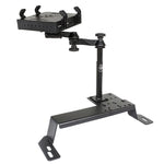This No-Drill™ Laptop Stand System installs quickly and easily into the specified vehicles using the existing passenger side seat rails hardware. This configuration provides a telescoping feature with upper and lower poles that allow users to set the mount to the desired height with the simple turn of a knob. Dual swing arms provide articulation and 12 inches of reach for passenger and driver access to the mounted device. The patented rubber ball and socket joint provide additional adjustment as well as shock and vibration isolation.