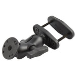 The RAM-101U-247-25 consists of a double socket arm, round 2.5" diameter round base with the universal AMPS hole pattern and 2.5" clamp base. The clamp base will wrap around a maximum width of 2.5" and is tightened by screwing the two plates together with the included nuts and bolts. Rubber ball, socket technology dampens shock and vibration, as well as allows for almost infinite adjustment, perfect viewing angles.