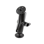 The RAM-D-101U consists of (2 qty) 3.68" diameter round bases and STANDARD length double socket arm. The 3.68" diameter round bases have pre-drilled holes, including two holes at 180 degrees and three holes at 120 degrees. Designed into the mount is a 2.25" diameter rubber ball and socket system with adjustment points at both socket ends of the arm.