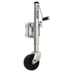 Fulton Bolt Thru Swivel Jacks feature swing-away design, with bolt thru mounting. Heavy duty steel construction with a zinc finish for corrosion resistance. 10" of travel with 6" poly wheel.