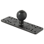 The RAM-111BU consists of a 1.5" diameter rubber ball connected at right angles to a flat 6.25 x 2" rectangular plate. The plate contains different combinations of pre-drilled holes which will match up to many electronic devices and mounts, including Marine GPS, CB Radios, Ham Radios, Gimbal Brackets and more.