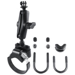 The RAM-B-149Z-2-GOP1U consists of a steel strap base, u-bolt bases, double socket arm and 1" diameter ball with custom GoPro Hero adapter. The mount is designed with a RAM 1" diameter patented rubber ball and socket system that has adjustment points at both ends of the double socket arm; this allowing for almost infinite adjustment and perfect viewing angles. Designed for a clean installation, the RAM strap mount will accommodate most common roll bar sizes, allowing for the placement of the RAM rubber ball base. This mount can also be attached to smaller diameter handlebars on ATVs using the included hardware.