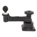 The RAM-109H-2BU consists of a 6" long STRAIGHT swing arm mounted on a horizontal surface mounting base. At the free end of the mount swing arm is a round 1.5" diameter ball. The connection between the swing arm and the base is a bolt pivot point, and the round plate and arm connection is the RAM ball and socket system. The bolt pivoting point allows a complete 360 degree rotation and the ball and socket system allows a 180 degree vertical pivot with a 360 degree rotation.