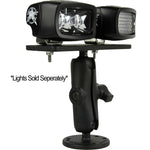This mount features a 2.5" diameter round base with 7 bolt holes. The base holds a 1" diameter ball that connects to a 3.69" long arm. At the end of the arm is another 1" diameter ball that connects to a 6.25" x 2" mounting plate. It is great for permanently mounting multiple SRM, SRQ, or D-Series lights on a flat surface with maximum adjustability.